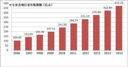 根据某机构的预测,2015年专业音响行业市场规模将增长至472.79亿元(如下图)。体育赛事、文化娱乐领域在专业音响的市场结构所占比例将继续提高,预计到2015年其占比将达到62.63%。