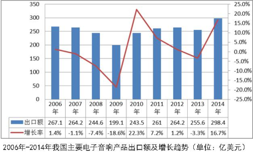 自1999年开始,我国主要电子音响产品产值以平均每年超过30%的增速上升,至2006年,产值已达2069.4亿元。但是,受企业产能过剩、用工成本增加、原材料价格上涨、人民币升值等因素综合影响,我国主要电子音响产品产值增速从2006年开始放缓,并于2007年开始出现负增长。在企业还未完全消化上述不良因素时,2008年开始国际金融危机、欧债危机又席卷全球,产品出口面临严峻形势。2010年行业虽然实现恢复性增长,产值恢复到危机前水平,但随着国际市场经济复苏的低迷,行业总体处于低速调整期。2014年,由于国际市场的复苏和我国居民收入增长较快、网络零售保持旺盛,国内国际市场均取得了良好的发展,行业消费热点如通讯器材的配套音箱、耳机等产品继续保持热度,行业复苏态势明显。