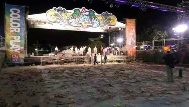 演出现场,DJ正在台上带动气氛,台下身着泳装的游客伴随音乐的节奏狂欢,舞台周边喷出各种颜色粉末(有报道称为玉米粉),台下顿时烟雾弥漫,此时舞台角落的音响设备不明原因冒出火花,现场陷入火焰中,有目击者描述,火势瞬间蔓延,火苗高达2米多。