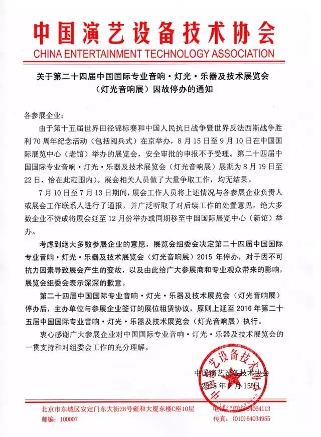 关于第二十四届中国国际专业音响·灯光·乐器及技术展览会(灯光音响展)因故停办的通知