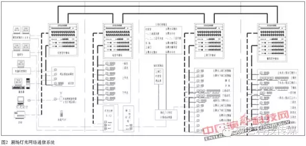 以笔者参与的中国西部某文化艺术中心剧场工程灯光网络系统为例。其整套系统的核心网络通信单元总共有4个,分布情况是灯控室1个,可控硅室1个,上场门1个,栅顶葡萄架上1个。4个网络通信单元之间由双备份的光纤连接,提高了数据传输的可靠性。控制室里的网络通信单元子网主要接入灯光控制台、电脑灯控制台、换色器控制台、烟雾剂控制器和监控设备,使得灯控室成为一个完备的剧场大脑,操作人员在灯控室就能通过其网络设备清楚地了解现场演出状态下分布在剧场各个角落的设备运行情况,并进行合理的操作。在可控硅室的网络通信单元子网接入6个调光(直通)立柜,并且通过DMX三芯信号线接入放置在舞台吊杆和一二层天桥的换色器、电脑灯。另外,作为顶光、耳光的扩展网络设备端口也接入此网络通信单元子网,上场门网络通信单元子网则接入流动可控硅柜,作为台口舞美效果临时扩充设备的备用端口,而栅顶网络通信单元子网则接入用于舞台口大屏幕网络LED显示屏和整个剧场网络设备的扩展端口。图2是剧场现场工程应用设备连接图。
