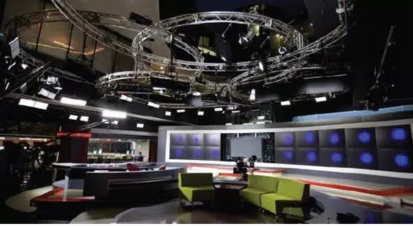 上海广播电视台东方卫视开放式演播室就是一个很好的例子,演播室如图4所示。该演播室在2011年改造期间引入众多的新元素,包括DLP大屏及PDP屏作为出镜背景。考虑到这些新型高色温光源设备的加入,灯光设计师最终选择高色温光源对演播室进行布光。在这次改造中,所有光源均采用高色温LED光源,使用LED平板柔光灯作为基础面光,LED聚光灯作为逆光以及侧光。通过改造,极大提升了整体荧屏视觉形象。同时,东方卫视作为高清频道已经迈入了高清化时代,其演播室改造成功无疑也为高色温光源在高清电视中应用树立了一个成功的典型。