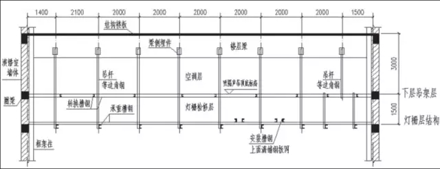 下层吊架结构位于空调层和灯光检修层中间,主要作用有:( 1)固定建筑吸、隔声层的龙骨,作为建筑吸、隔声层的主承重构件;( 2)安装单机吊点,并承受单机吊点的荷载;( 3)当竖向吊杆不能直接从上层吊架连接到灯栅层时,吊杆位置可以在下层吊架层进行转换。下层吊架结构的槽钢在平面内双向布置,槽钢间距一般 3m左右为宜。
